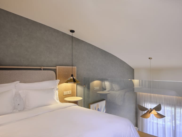 Relax in a split-level loft with botanical-themed furnishings, green accents, and natural wood decor. Sleep on a queen bed surrounded by soft textiles. Step onto the balcony to feel the calm of nature blending indoors and outdoors.