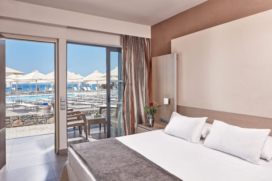 Stay in a bright, sea-view family room, located on the ground floor, for up to four guests. The separate bedrooms and two cosy sofa beds or single beds ensure restful nights and personal space. The earthy interiors and a furnished terrace invite you to relax. Step outside and admire the sparkling blue sea stretching beyond the horizon.