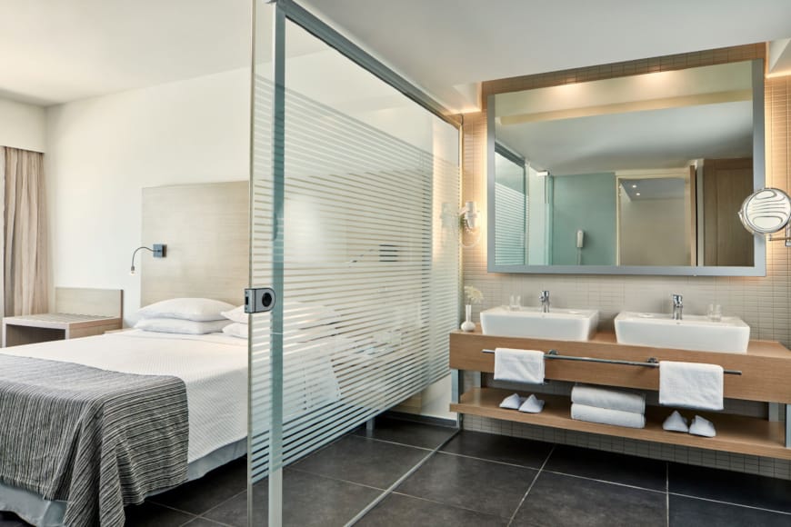 Lounge in a stylish suite with sea views and direct poolside access. The double bed and living area with two sofa beds offer space to relax. Step onto your terrace and soak in sun-drenched moments by the shared pool. The pool comes complete with loungers and the endless blue ahead.