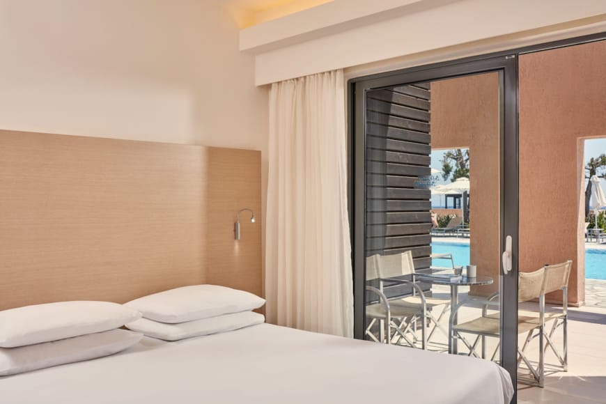 Enjoy generous comfort with a sea breeze and shared smiles. A sliding door offers privacy between a double bed and two sofa beds. Take in glowing afternoon light from your private balcony or terrace. Let your family unwind where space and sea views meet.